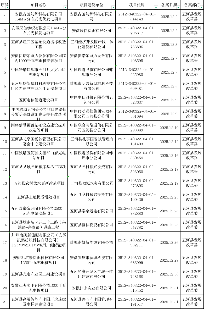 五河县发展改革委2025年12月份企业投资项目备案情况