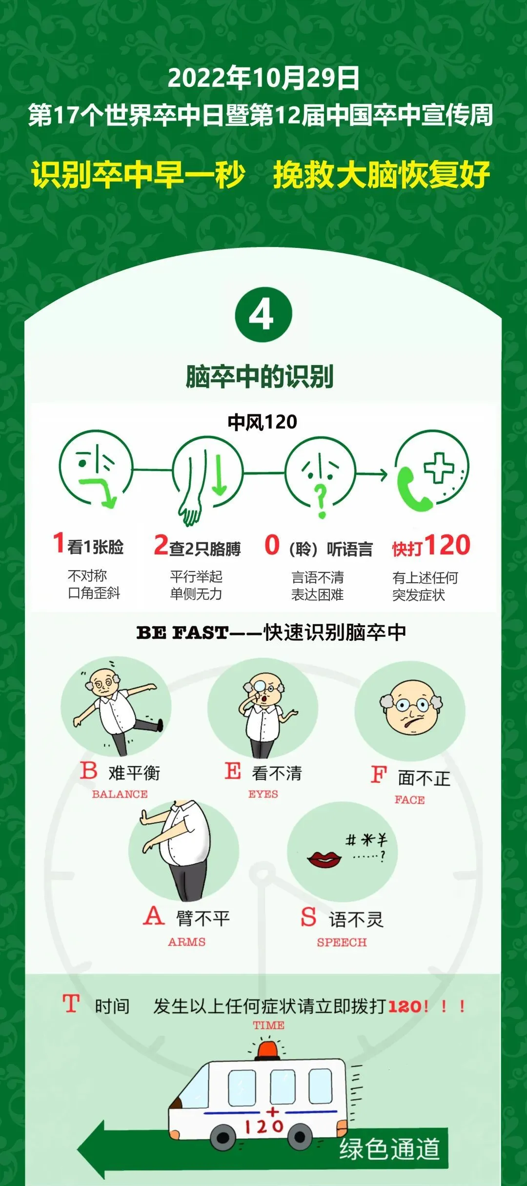“中风120”口诀是一种适用于民众的迅速识别脑卒中和即刻行动的策略: