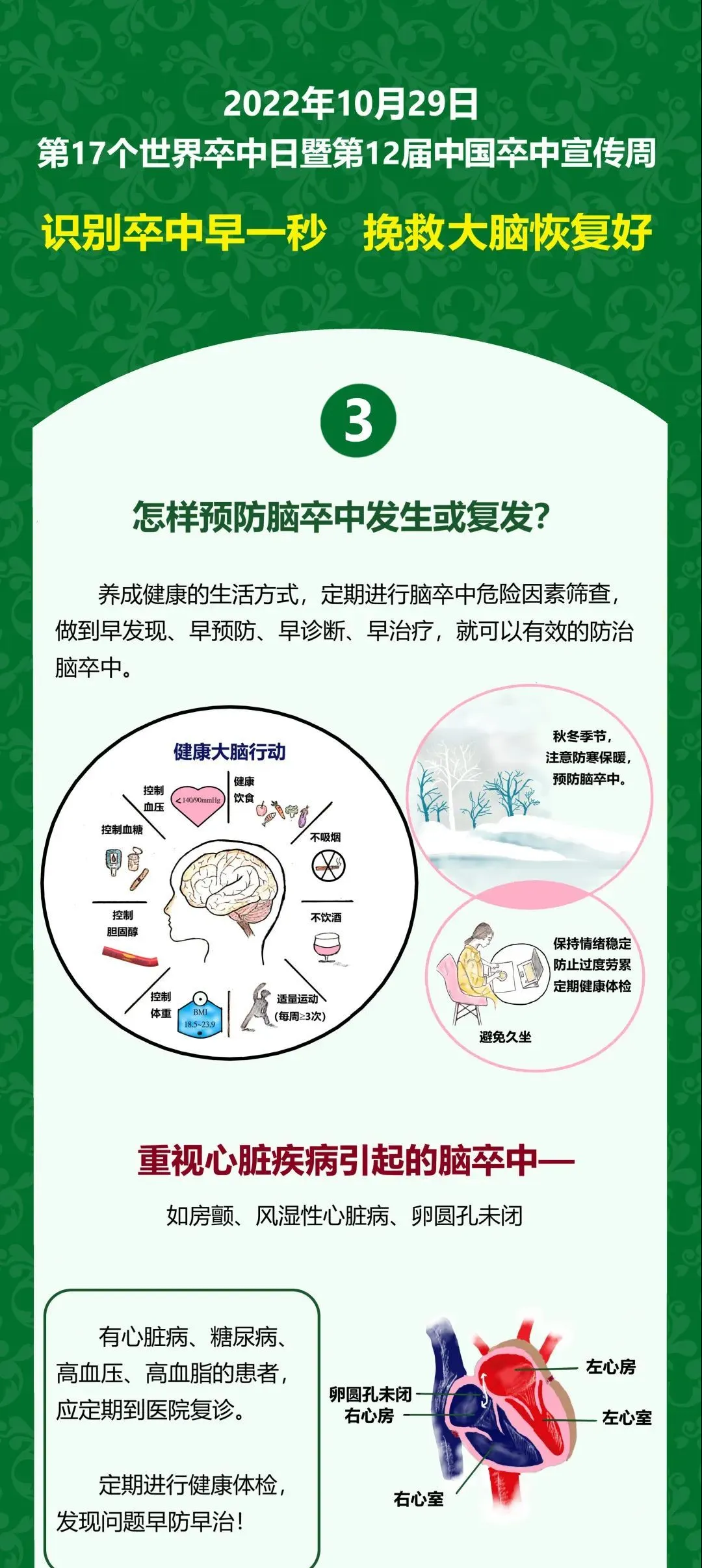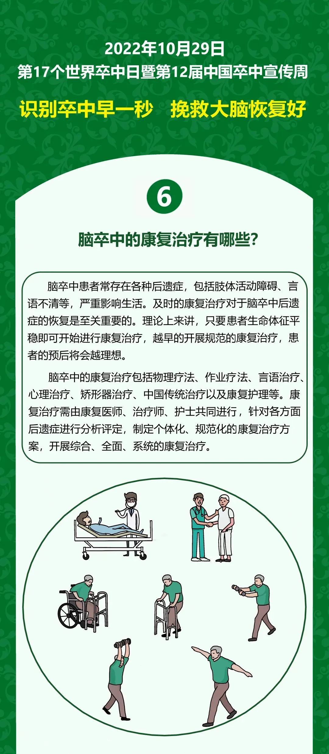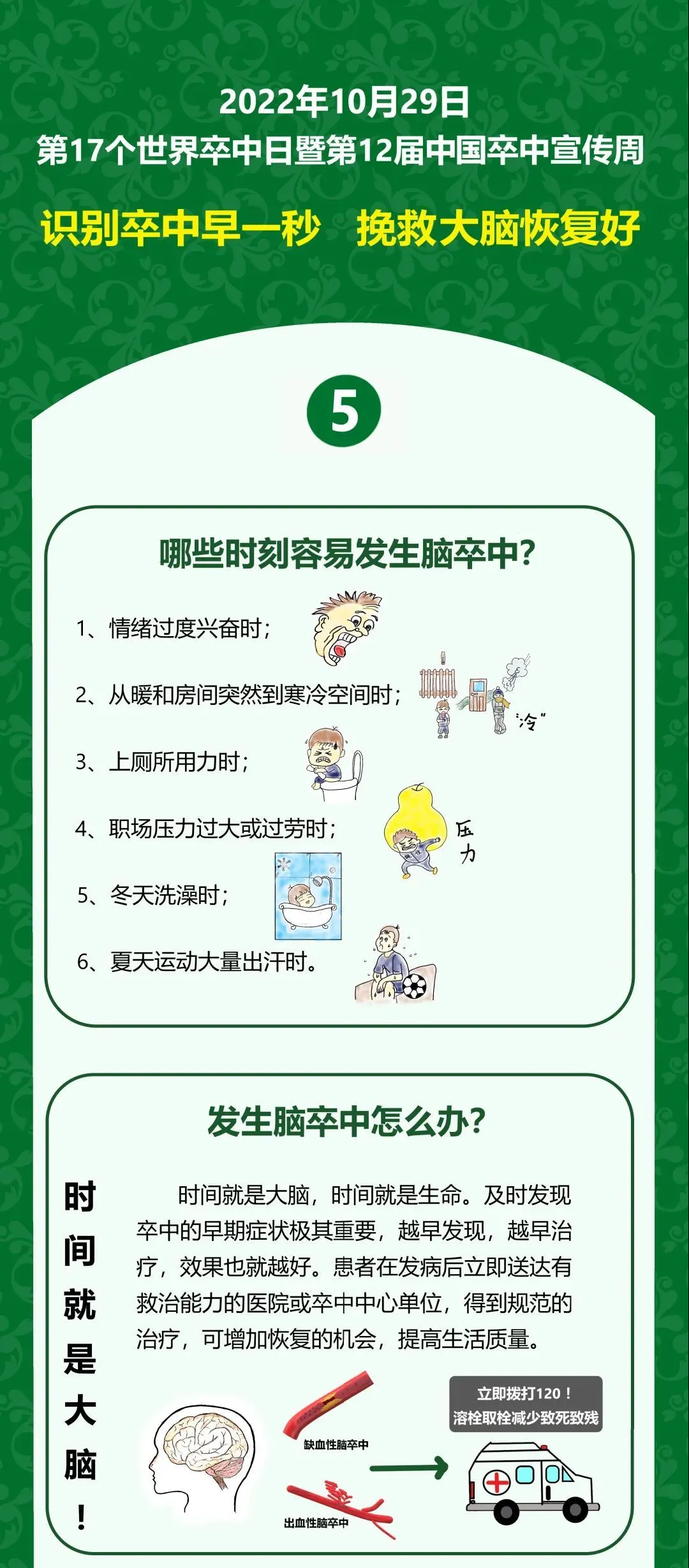 5.提升以预防为主的健康意识,积极参与、配合当地医疗卫生机构开展脑卒中高危人群筛查、干预等活动。关注所在城市的卒中急救地图和生活区域的卒中中心。