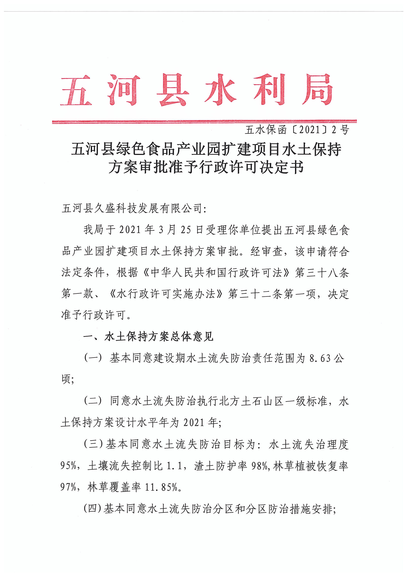 五河县绿色食品产业园扩建项目水土保持方案审批准予行政许可决定书